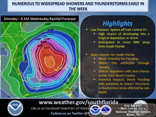 The first tropical storm of the 2014 Atlantic Hurricane Season, TS Arthur, has formed off the east coast of Central Florida. As of 11:00am, the maximum sustained wind for this system was 40 mph and it was moving northwest at 2mph. Although this system is expected to begin moving north/northeast and remain at tropical storm strength until it reaches the Carolinas, Palm Beach will receive heavy rainfall and gusty winds today and tomorrow. Due to dangerous lightning in the outer bands of TS Arthur, public beaches have been closed until further notice.