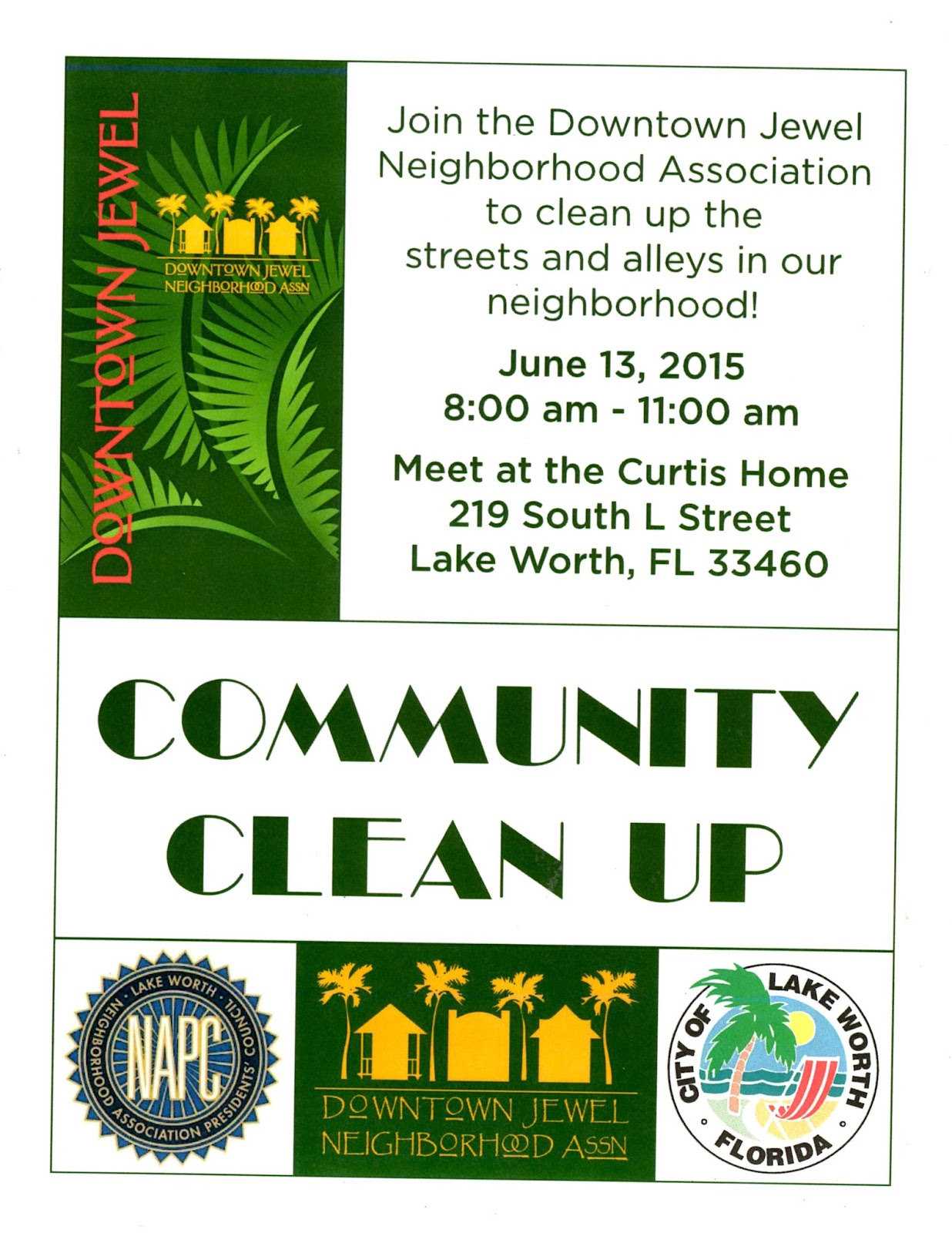 On Saturday, June 13th, the Downtown Jewel Neighborhood Association (DJNA) will have a neighborhood clean up. You don't have to be a member to participate. If you've thought of joining your own neighborhood association visit the Lake Worth Neighborhood Association Presidents Council (NAPC) to find out which NA represents you.